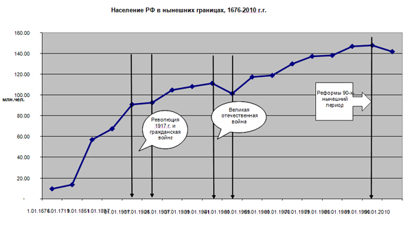 Даже в период гражданской войны – по данным с 1917 по 1926 население России в нынешних границах выросло на 1.7 млн.человек. Росло оно даже в период репрессий - по статистике с 1926 по 1937 – на 12.2 млн.человек. Наибольший провал составил период Великой Отечественной войны – по данным с 1941 по