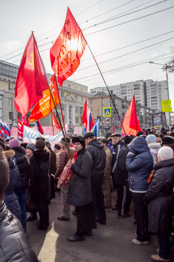 10 марта в Челябинске прошёл митинг, организованный проправительственным движением "За возрождение Урала". Хотя это даже не митинг, это было больше похожее на народные гуляния и местами под них же и стилизованно. Начало сбора на этот митинг с шествием планировалось в 11:30 на Алом поле, но уже к 11:00, когда туда подошли с целью разведки челябинские большевики, народу было много. Рядом с небольшим памятником Ленина там расположилась машина Ростелекома, из которой играла какая-то попсовая песня про любовь, что не могло не вызывать смеха. Подготовка к митингу была в самом разгаре, несмотря на раннее время - повсюду люди разворачивали триколоры и прочую символику, что символично, учитывая, что бандеровцы и власовцы были в Великой Отечественной войне союзниками. Несколько минут спустя под революционные песни приехала машина с символикой КПРФ, остановившись неподалёку от места сбора, правда, она перестала издавать чуждые происходящему звуки, переключившись на те же песни, что и стоящая в нескольких десятках метров машина Ростелекома. Исполнение песен не к месту до и вовремя этого митинга заслуживает отдельного внимания. За неимением песен в тему буржуазия включала абсолютно любую музыку, причём до митинга, похоже, просто песни с радио через динамики звучали(если это и не так, то казалось именно так). Уже на построении колонны было видно, что на митинге представлен весь "свет" организаций Челябинска, кого там только не было: единороссы и их коллеги из Народного фронта с лозунгами "Мы верим Путину", ЛДПР с националистическими лозунгами, КПРФ... Присутствовал на митинге и флаг русских националистов, а так же символика националистических объединений. Когда колонна митинга дошла до площади Революции там играла песня "Давай Россия!", даже казалось, что это митинг в поддержку олимпийских спортсменов и он совершенно не связан с происходящим на Украине. Всё прояснил голос буржуа, ведущего митинг. Он-то пояснил, что все здесь собрались в поддержку Путина(на что представители псевдооппозиционных партий никак не отреагировали) и его действий, весь последующий митинг прошёл в этом ключе, ключе единства националистов, путинистов и примкнувшей к ним КПРФ. Из-за обилия националистов на митинге появлялись мысли, что в этот день в Челябинске собралось фашистов не меньше, чем в Киеве.