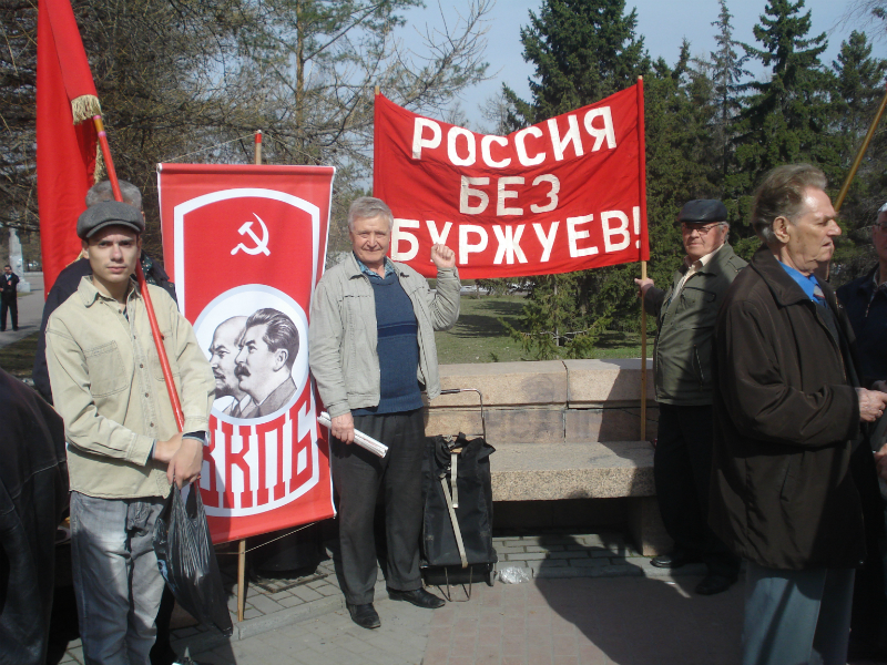 В г.Челябинске 1 мая состоялась демонстрация и митинг на "Алом Поле" у памятника В. И. Ленина, посвящённые Дню Международной солидарности трудящихся. Демонстрация и митинг прошли под лозунгом: "Россия без буржуев!", выдвинутый челябинскими большевиками. Активисты Челябинского горкома Всесоюзной Коммунистической партии большевиков (ВКПБ) оформили этим лозунгом и гербом СССР трибуну митинга. Такое оформление трибуны митинга напоминало, без слов, всем участникам митинга и простым гражданам, отдыхающих в сквере "Алого Поля", что В. И. Ленин будет очень рад, если рабочий класс организуется и под руководством современных большевиков освободит Россию от буржуев, восстановит Советскую власть и СССР. Это нужно сделать как можно быстрее. Так трактовали оформление трибуны участники митинга и многие граждане, которые в течении 30 минут после окончания митинга просили активистов ВКПБ не снимать лозунг и герб СССР и дать им возможность сфотографироваться. Выступающие на митинге также ссылались на актуальность лозунга: "Россия без буржуев!". Из выступления сторонника - активиста челябинских большевиков, рабочего Челябинского завода Уралавтоприцеп тов. Стрюкова Владимира Николаевича: "12 апреля этого года Челябинск посетили с важным визитом Д. Рогозин (вице - примьер правительства РФ) и И. Холманских (полномочный представитель президента РФ в УрФО). Они решали вопросы размещения гособоронзаказа, в том числе, на заводах "АМЗ" (автоматно - механический завод) и "Станкомаше" (завод имени Серго Орджоникидзе). Оказывается - оба завода обанкротили. Разместить оборонзаказ нельзя. Разорвана технологическая цепочка по производству вооружения для Российской армии. Армия не получит нового оружия для противостояния агрессивному Западу, НАТО и США. Да разве одни "АМЗ" и "С. Орджоникидзе" разорены? Что осталось от ЧМЗ, от ЧТЗ? От ЧТЗ остался один моторный завод. Остальные цеха закрыты и по ним бегают крысы. Начали строить метро ещё в советское время для перевозки в основном рабочих на ЧТЗ и обратно по городу. Деньги украли, метро нет и ЧТЗ нет! Наш лозунг - Россия без буржуев!" С 1991 года нам рассказывают сказки об эфективности "эфективных собственников, управленцев, мененджеров - буржуев" Эту "эфективность" мы на своей спине испытываем. Что делать? Собрать их всех в крепкий мешок, хорошо завязать и отправить их на Запад, к своим хозяевам. Пускай там работают "эфективно". Россия их терпела 23 года, хватит. Россия терпеливая, а Запад не выдержит и года - всё растащат все разворуют и ничего не оставят".