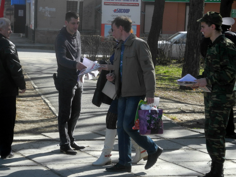 В течение 3-х часов мы распространяли большевистскую печать: «Рабоче-крестьянский Серп и Молот, РЕВОЛЮЦИЯ, Рабоче-крестьянская Правда» и листовки: «США, НАТО, ЕС, НАЦИСТЫ: Руки прочь от народа Украины!» с поздравлением ЦК ВКПБ и «