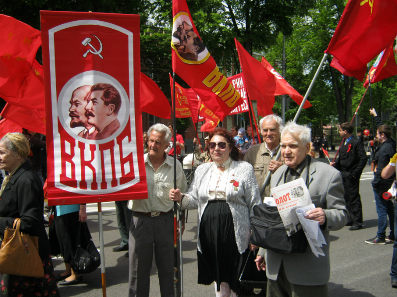 В г. Пятигорске, в год 100-летия Великой Октябрьской Социалистической Революции в России, в 72-ю годовщину Победы советского народа над фашистской Германией в Великой Отечественной войне 1941-1945 г., большевики, с красными бантами на левой стороне груди, приняли участие в демонстрации, посвящённой этой замечательной дате, выставив красные знамёна ВКПБ с изображением на них портретами вождей В.И. Ленина и И.В. Сталина, красными флагами СССР, Штандартом ВКПБ, баннеры с портретами В.И. Ленина и И.В. Сталина, Герба СССР, « Имя Победы – И.В. Сталин!», «Большевики – маршалы Победы», « Парад Победы на Красной площади в г. Москве у Мавзолея В.И. Ленина» - бросание фашистских штандартов и знамён, вдоль движения колонн демонстрантов на расстоянии свыше 25 метров, ниже транспарантов на железной оградке были закреплены 2 баннера с призывами.