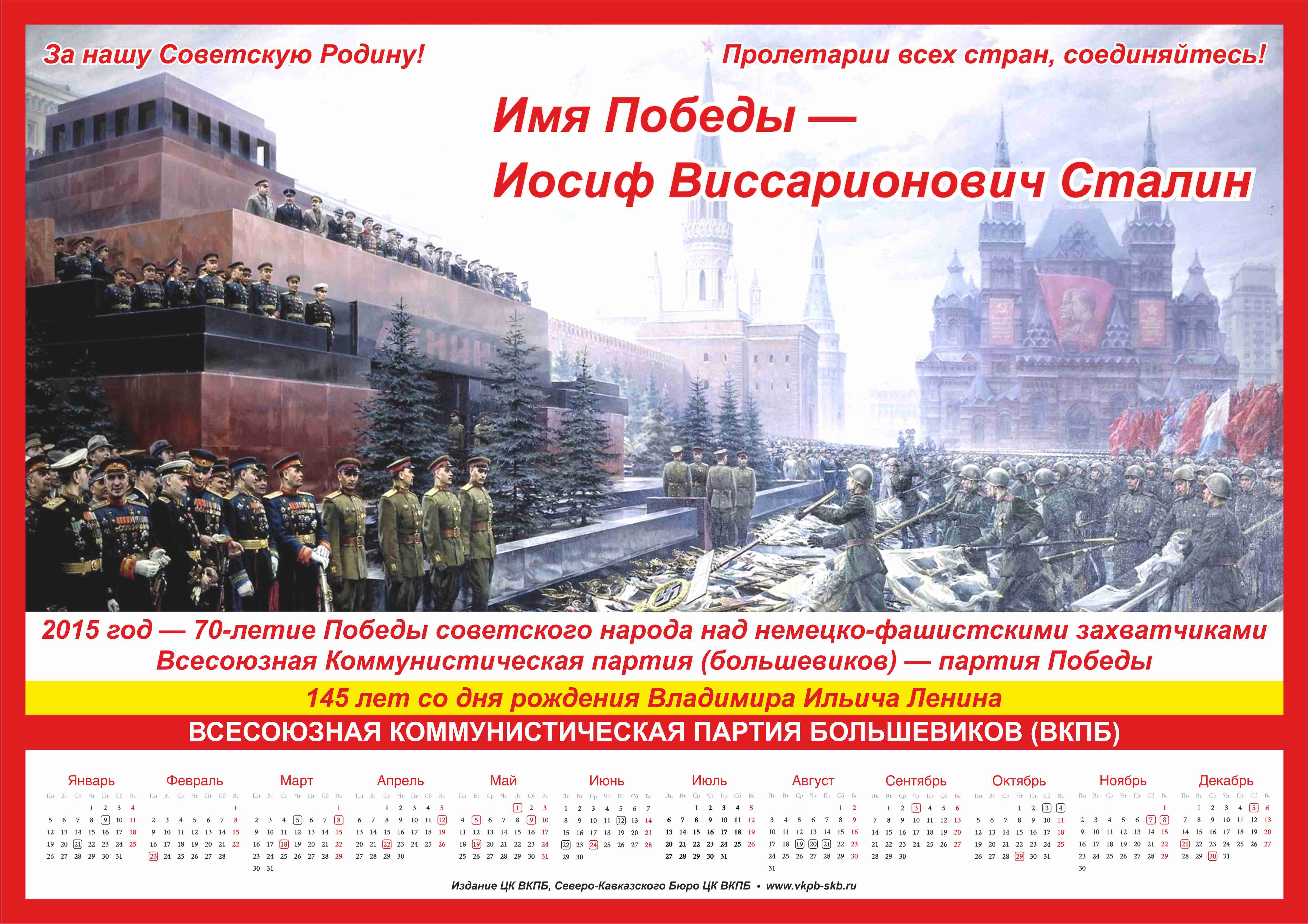 Издание ЦК ВКПБ Северо-Кавказское Бюро ЦК ВКПБ издает цветные баннеры и календари с портретами Ленина и Сталина и с советскими символами (для парторганизаций ВКПБ). Фотографии смотрите ниже.Адрес для Заказчика: Дегтяренко Николай Ананьевич E-mail: Этот адрес электронной почты защищен от спам-ботов. У вас должен быть включен JavaScript для просмотра.