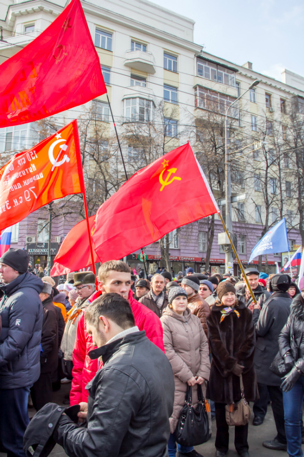 10 марта в Челябинске прошёл митинг, организованный проправительственным движением "За возрождение Урала". Хотя это даже не митинг, это было больше похожее на народные гуляния и местами под них же и стилизованно. Начало сбора на этот митинг с шествием планировалось в 11:30 на Алом поле, но уже к 11:00, когда туда подошли с целью разведки челябинские большевики, народу было много. Рядом с небольшим памятником Ленина там расположилась машина Ростелекома, из которой играла какая-то попсовая песня про любовь, что не могло не вызывать смеха. Подготовка к митингу была в самом разгаре, несмотря на раннее время - повсюду люди разворачивали триколоры и прочую символику, что символично, учитывая, что бандеровцы и власовцы были в Великой Отечественной войне союзниками. Несколько минут спустя под революционные песни приехала машина с символикой КПРФ, остановившись неподалёку от места сбора, правда, она перестала издавать чуждые происходящему звуки, переключившись на те же песни, что и стоящая в нескольких десятках метров машина Ростелекома. Исполнение песен не к месту до и вовремя этого митинга заслуживает отдельного внимания. За неимением песен в тему буржуазия включала абсолютно любую музыку, причём до митинга, похоже, просто песни с радио через динамики звучали(если это и не так, то казалось именно так). Уже на построении колонны было видно, что на митинге представлен весь "свет" организаций Челябинска, кого там только не было: единороссы и их коллеги из Народного фронта с лозунгами "Мы верим Путину", ЛДПР с националистическими лозунгами, КПРФ... Присутствовал на митинге и флаг русских националистов, а так же символика националистических объединений. Когда колонна митинга дошла до площади Революции там играла песня "Давай Россия!", даже казалось, что это митинг в поддержку олимпийских спортсменов и он совершенно не связан с происходящим на Украине. Всё прояснил голос буржуа, ведущего митинг. Он-то пояснил, что все здесь собрались в поддержку Путина(на что представители псевдооппозиционных партий никак не отреагировали) и его действий, весь последующий митинг прошёл в этом ключе, ключе единства националистов, путинистов и примкнувшей к ним КПРФ. Из-за обилия националистов на митинге появлялись мысли, что в этот день в Челябинске собралось фашистов не меньше, чем в Киеве.