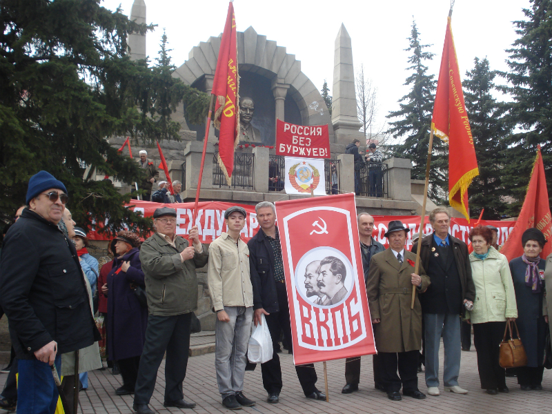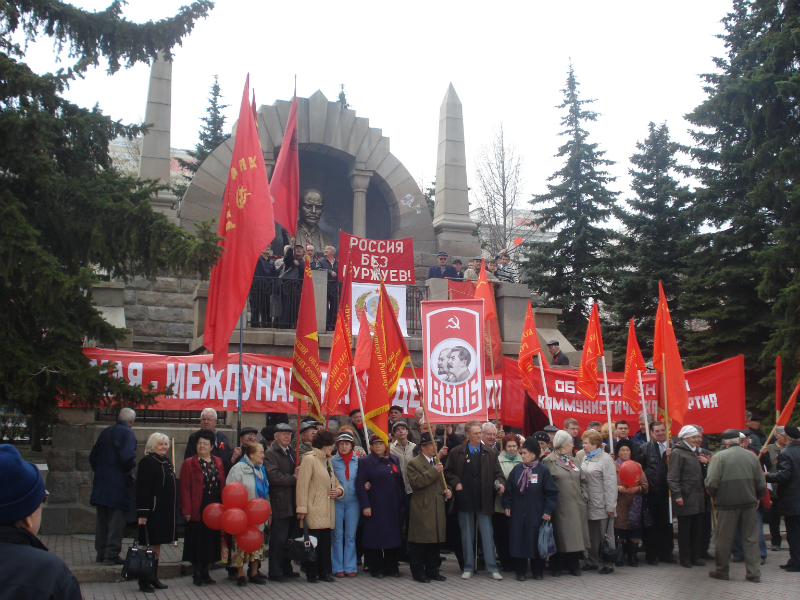 В г.Челябинске 1 мая состоялась демонстрация и митинг на "Алом Поле" у памятника В. И. Ленина, посвящённые Дню Международной солидарности трудящихся. Демонстрация и митинг прошли под лозунгом: "Россия без буржуев!", выдвинутый челябинскими большевиками. Активисты Челябинского горкома Всесоюзной Коммунистической партии большевиков (ВКПБ) оформили этим лозунгом и гербом СССР трибуну митинга. Такое оформление трибуны митинга напоминало, без слов, всем участникам митинга и простым гражданам, отдыхающих в сквере "Алого Поля", что В. И. Ленин будет очень рад, если рабочий класс организуется и под руководством современных большевиков освободит Россию от буржуев, восстановит Советскую власть и СССР. Это нужно сделать как можно быстрее. Так трактовали оформление трибуны участники митинга и многие граждане, которые в течении 30 минут после окончания митинга просили активистов ВКПБ не снимать лозунг и герб СССР и дать им возможность сфотографироваться. Выступающие на митинге также ссылались на актуальность лозунга: "Россия без буржуев!". Из выступления сторонника - активиста челябинских большевиков, рабочего Челябинского завода Уралавтоприцеп тов. Стрюкова Владимира Николаевича: "12 апреля этого года Челябинск посетили с важным визитом Д. Рогозин (вице - примьер правительства РФ) и И. Холманских (полномочный представитель президента РФ в УрФО). Они решали вопросы размещения гособоронзаказа, в том числе, на заводах "АМЗ" (автоматно - механический завод) и "Станкомаше" (завод имени Серго Орджоникидзе). Оказывается - оба завода обанкротили. Разместить оборонзаказ нельзя. Разорвана технологическая цепочка по производству вооружения для Российской армии. Армия не получит нового оружия для противостояния агрессивному Западу, НАТО и США. Да разве одни "АМЗ" и "С. Орджоникидзе" разорены? Что осталось от ЧМЗ, от ЧТЗ? От ЧТЗ остался один моторный завод. Остальные цеха закрыты и по ним бегают крысы. Начали строить метро ещё в советское время для перевозки в основном рабочих на ЧТЗ и обратно по городу. Деньги украли, метро нет и ЧТЗ нет! Наш лозунг - Россия без буржуев!" С 1991 года нам рассказывают сказки об эфективности "эфективных собственников, управленцев, мененджеров - буржуев" Эту "эфективность" мы на своей спине испытываем. Что делать? Собрать их всех в крепкий мешок, хорошо завязать и отправить их на Запад, к своим хозяевам. Пускай там работают "эфективно". Россия их терпела 23 года, хватит. Россия терпеливая, а Запад не выдержит и года - всё растащат все разворуют и ничего не оставят".