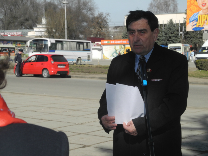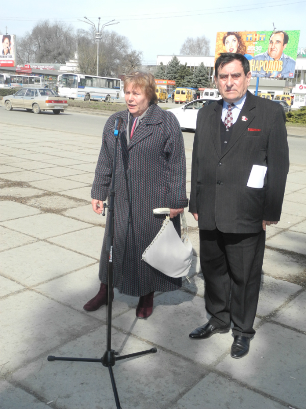 Перед собравшимися выступил т.Дегтяренко Н.А. – секретарь Пятигорского ГК ВКПБ,тепло встреченный на митинге и зачитал обращение коммунистических и рабочих партий мира: « США,НАТО,ЕС,нацисты: РУКИ ПРОЧЬ ОТ НАРОДА УКРАИНЫ!» - Призыв к международной солидарности.