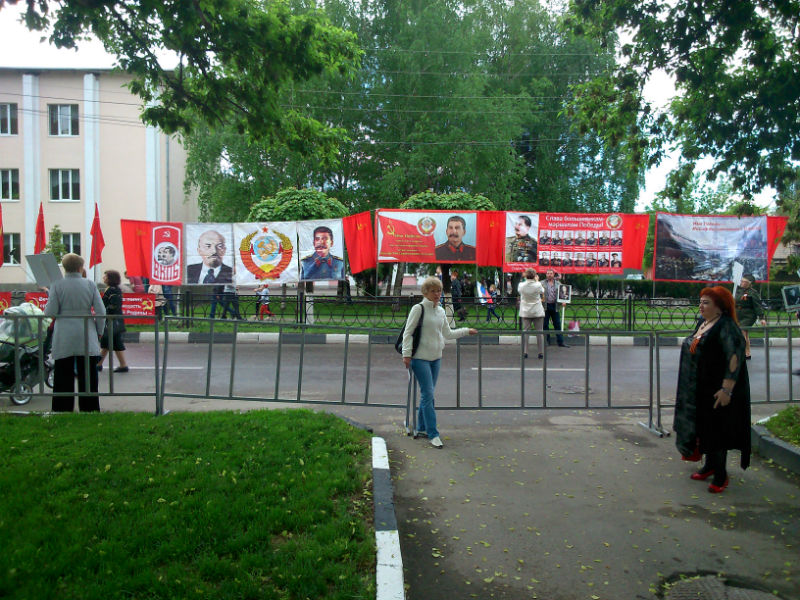 Были выставлены: Штандарт ВКПБ, красный флаг ВКПБ с портретами вождей В.И. Ленина и И.В. Сталина, красные флаги СССР с серпом и молотом, баннеры с портретом И.В. Сталина и Гербом СССР, возложены цветы …