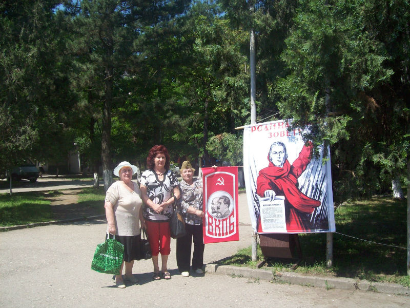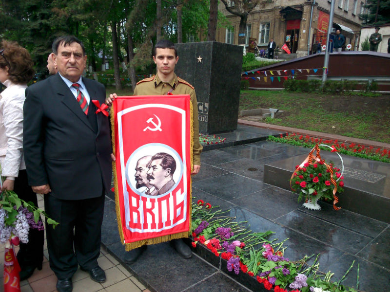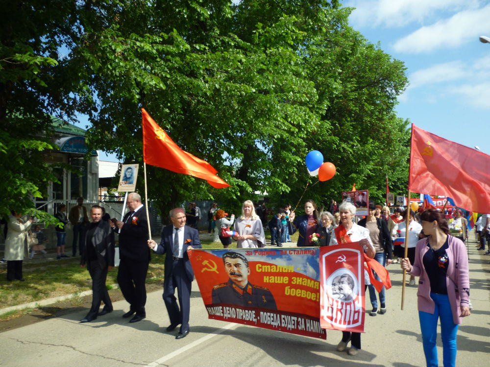В г. Пятигорске, в год 100-летия Великой Октябрьской Социалистической Революции в России, в 72-ю годовщину Победы советского народа над фашистской Германией в Великой Отечественной войне 1941-1945 г., большевики, с красными бантами на левой стороне груди, приняли участие в демонстрации, посвящённой этой замечательной дате, выставив красные знамёна ВКПБ с изображением на них портретами вождей В.И. Ленина и И.В. Сталина, красными флагами СССР, Штандартом ВКПБ, баннеры с портретами В.И. Ленина и И.В. Сталина, Герба СССР, « Имя Победы – И.В. Сталин!», «Большевики – маршалы Победы», « Парад Победы на Красной площади в г. Москве у Мавзолея В.И. Ленина» - бросание фашистских штандартов и знамён, вдоль движения колонн демонстрантов на расстоянии свыше 25 метров, ниже транспарантов на железной оградке были закреплены 2 баннера с призывами.