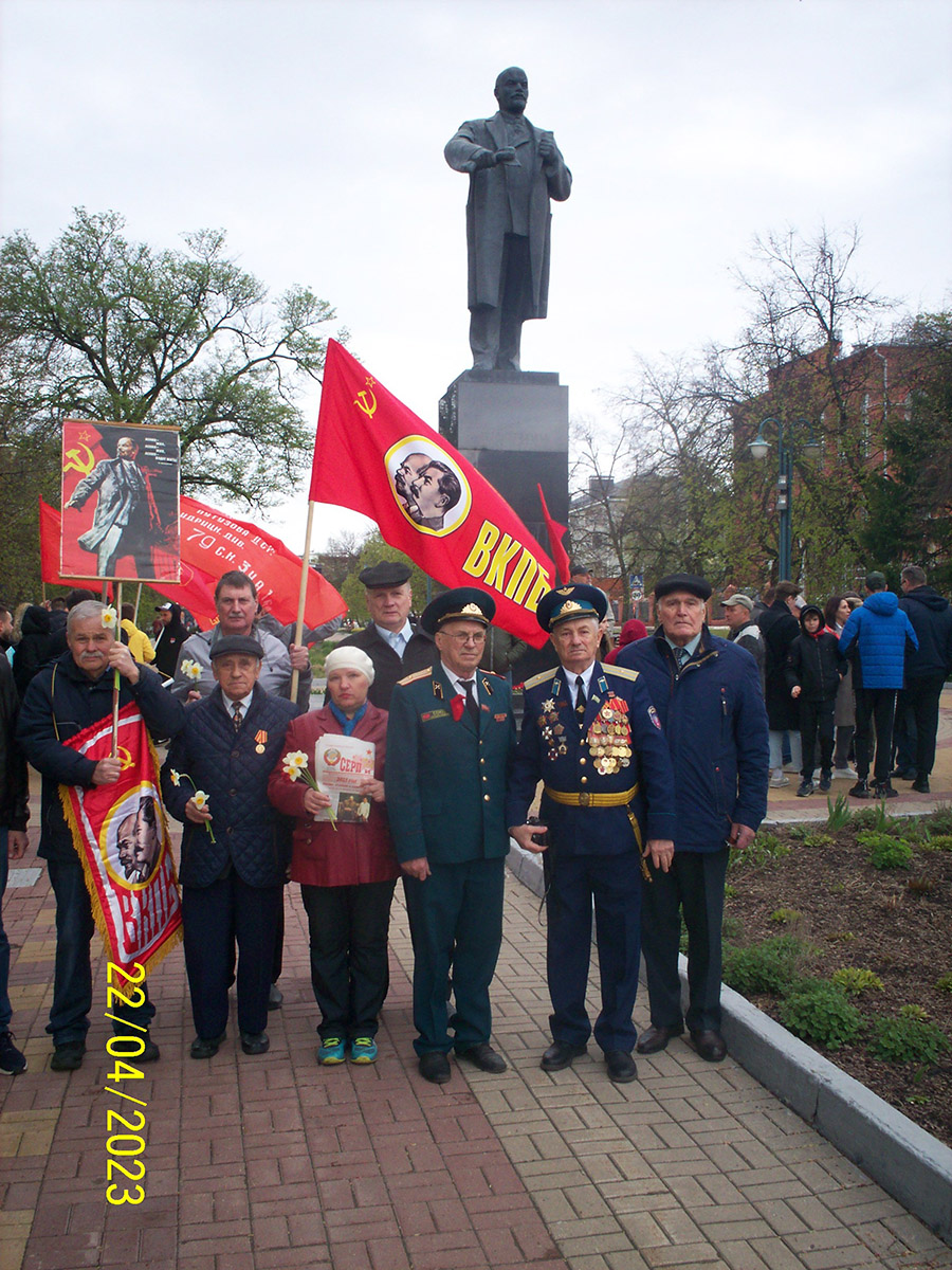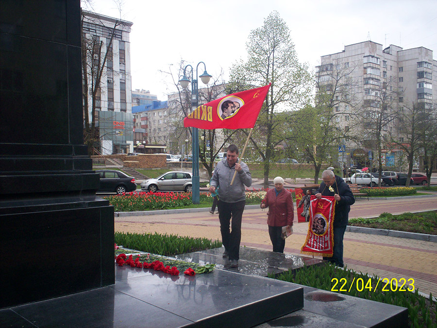 цветы к подножию памятников В.И. Ленина. Выставлялись: Штандарты ВКПБ, красные флаги ВКПБ с изображением вождей В.И. Ленина и И.В. Сталина, красные флаги СССР, распространялась газета "СЕРП и Молот БОЛЬШЕВИКА".